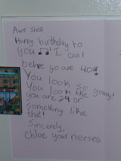 This was quite possibly the best 40th birthday present in the history of 40th birthdays. Who would not be over the moon about receiving these sentiments on a “sensitive” day such as this? Granted, World’s Most Precious Niece is only eight years old, but she is one smart cookie, I assure you. (Her teachers happen to agree with me.)